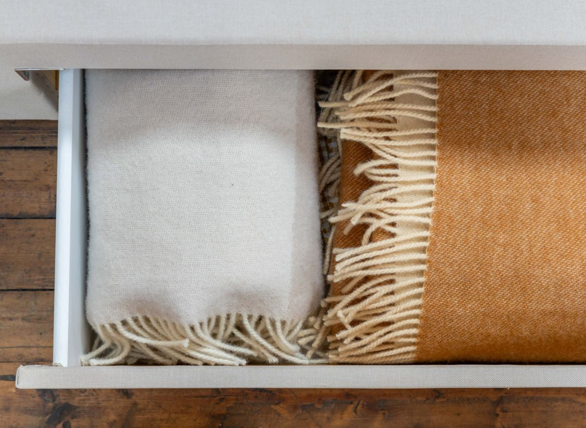 Our drawers easy glide on metal runners and are upholstered in the same base fabric.